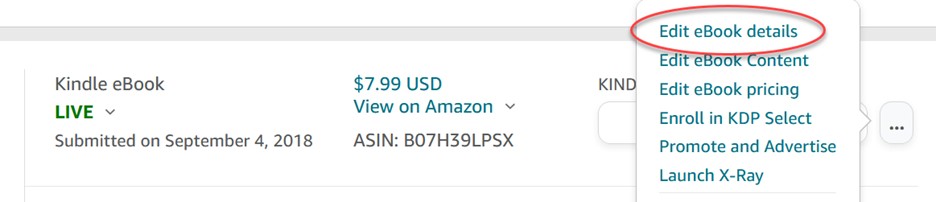 - Click on the ellipsis menu next to your title, and then click “Edit eBook details” or “Edit Paperback details.”
